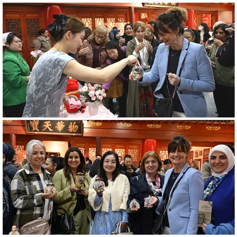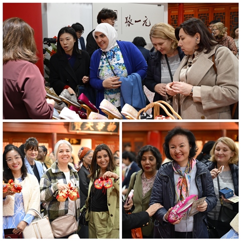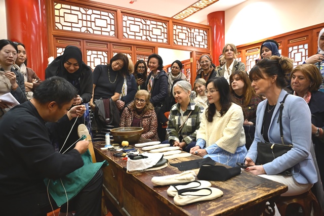 At Neiliansheng Shoe Shop, the ambassadors’ spouses were captivated by the exquisite old Beijing cloth shoes, particularly the colorful and intricately embroidered patterns. The trendy cloth shoes designed to cater to modern consumer preferences also received high praise. The participants visited an exhibition highlighting the century-long development of Neiliansheng Shoe Shop, watched an intangible cultural heritage master demonstrate the intricate process of crafting the brand's signature "thousand-layer sole" cloth shoes, and experienced traditional techniques and specialty products from brands such as Zhangyiyuan (tea shop) and Tianhuizhai (snuff shop).