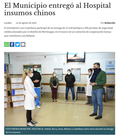 Recently, these supplies have been quickly distributed upon arrival to the local hospitals in Esperanza and Rafaela, which effectively support the frontline epidemic prevention and control.