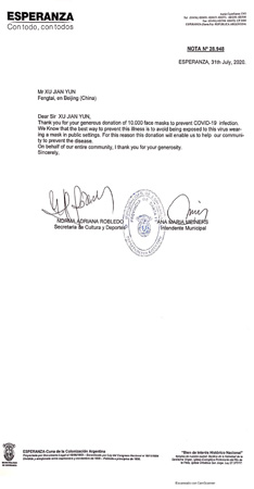(On July 31, Ana Maria Meiners, Mayor of Esperanza, sent a letter of thanks to the Fengtai District Committee and District Government, stating that the donated masks will effectively support the city’s epidemic control.)