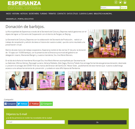 (The website of Esperanza government posted the news of receiving the donated masks, which, together with other anti-epidemic supplies, have been transferred to the SamCo Hospital.)
